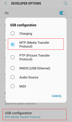 Für Android 6.0 und höher tippen Sie bitte weiterhin auf "USB-Konfiguration" und wählen Sie "MTP (Media Transfer Protocol)". Wenn die MTP-Option nicht funktioniert, versuchen Sie es stattdessen mit "RNDIS (USB Ethernet)", "Audio Source" oder "MIDI".