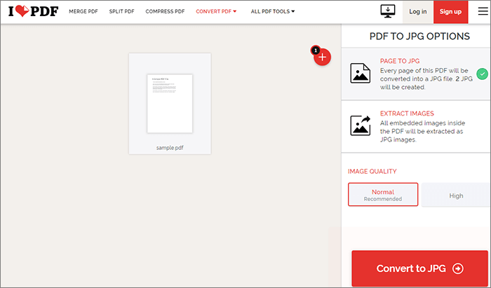 Paso 2. Elija la opción Página a JPG para convertir cada página del PDF en una imagen. Establezca el nivel de calidad en Alto y haga clic en Convertir a JPG.