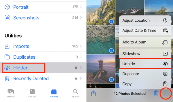 Step 4. Now, you can see all the photos in the Hidden album section. Select your photos of interest and tap the Unhide option.