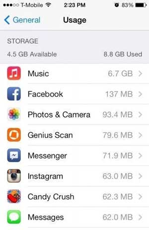 まず、iDeviceで使用可能なストレージ容量と使用済みストレージ容量を最初に確認できます。これを行うには、「設定」>「一般」>「使用法」に移動します。ここでは、すべてのアプリをタップしてキャッシュを手動でクリアできます。ただし、 ここをクリックして、iPhoneのストレージスペースを効果的にクリアする方法に関するガイドを学ぶこともできます。