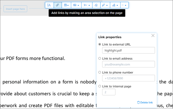 Step 4. Navigate your PDF file to locate the hyperlinks you want to remove. Click on the link to open the Link properties dialog box. Hit the Delete link button to remove the unwanted hyperlink.